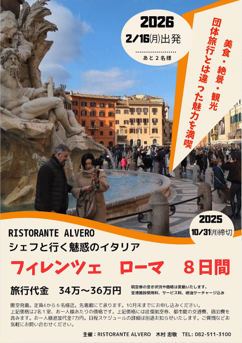 | ALVEROシェフ同行!美食と絶景!ショッピング満喫のイタリア旅行! |