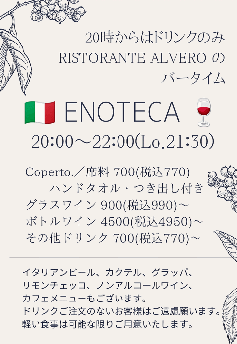 料理のラストオーダーは20時。ドリンクのラストオーダーは21時半です。