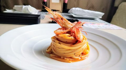 スクモエビは瀬戸内海に生息する車海老科のエビで、新鮮なものは味噌が濃厚で美味しく、身もくせのない甘味があります。『RISTORANTE ALVERO』では、殻もこんがりとソテーし丸ごと食べていただけるように仕上げ、ローマの老舗レストランのエビのパスタのソースを再現し、皆様にご好評いただいております。